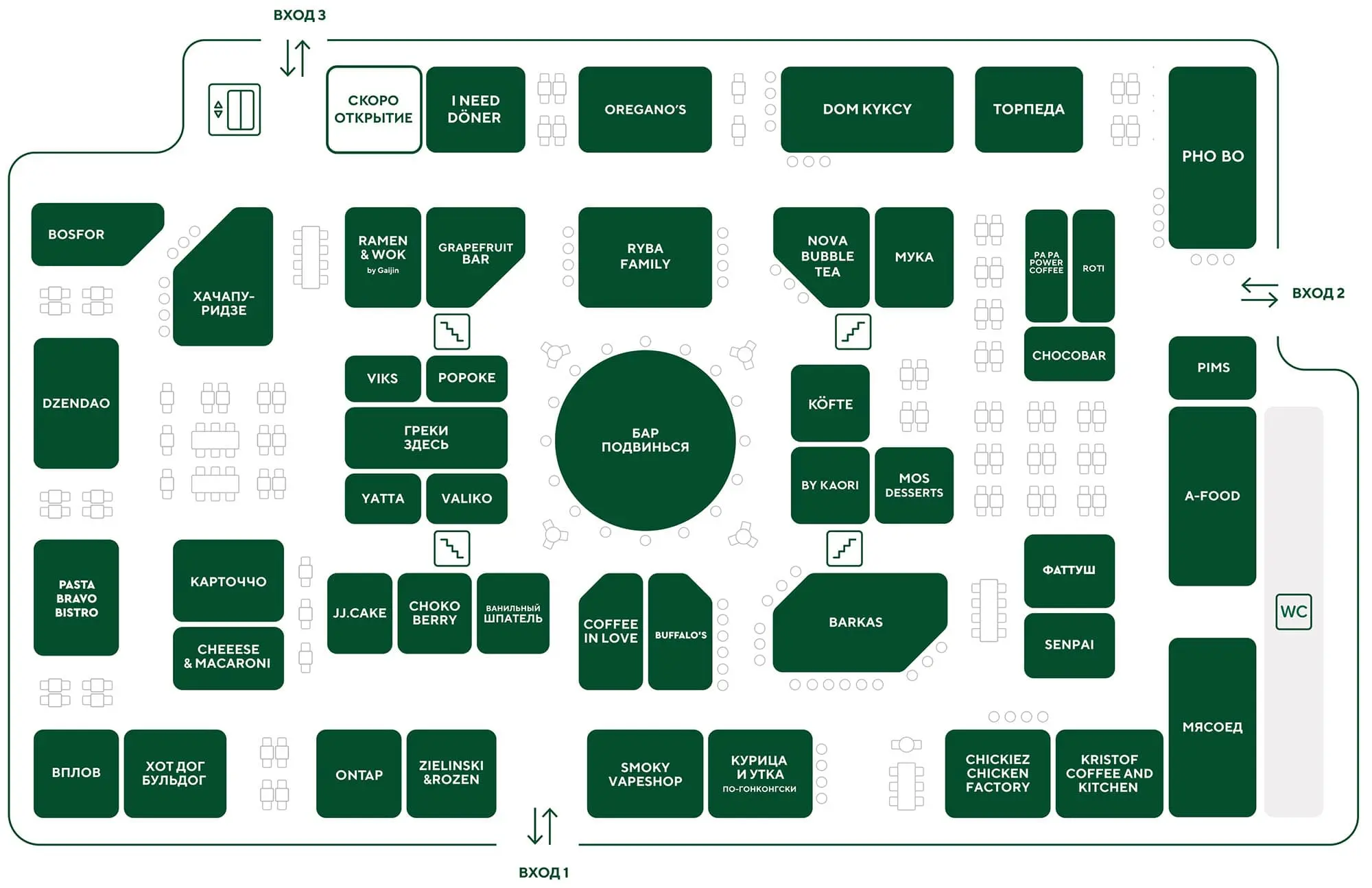 Подвинься – уютный бар, принадлежащий холдингу GG Group. В центре фудхолла находится круглая барная стойка, за которой вы можете насладиться изысканными коктейлями. Барная карта предлагает около 15 видов игристых и тихих вин, доступных по бокалам и бутылкам, крепкие алкогольные напитки и авторские интерпретации классических коктейлей.