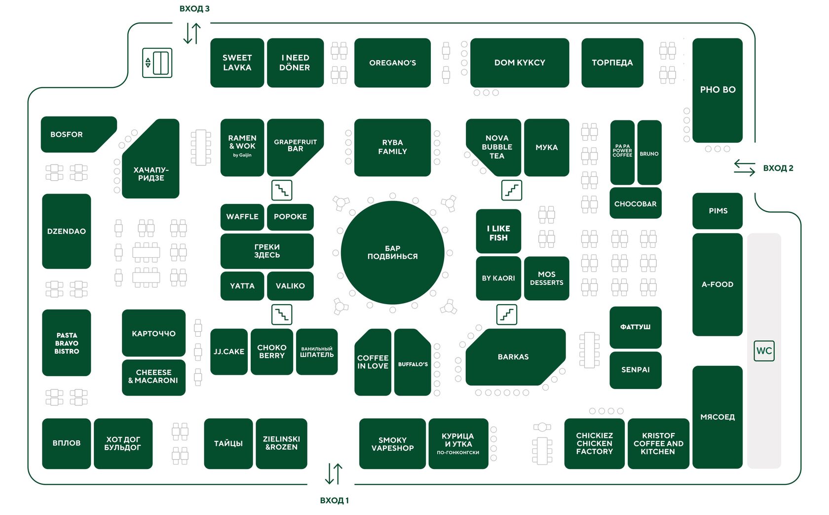 «Подвинься» — уютный бар, принадлежащий холдингу GG Group. В центре фудхолла находится круглая барная стойка, за которой вы можете насладиться изысканными коктейлями. Барная карта предлагает около 15 видов игристых и тихих вин, доступных по бокалам и бутылкам. Так же, здесь можно насладиться крепкими алкогольными напитками и авторскими интерпретациями классических коктейлей.